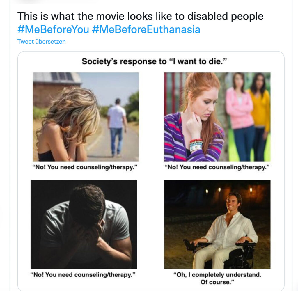 Natürlich ist es nicht nötig, alles, was man schreibt, erzählt, in einem Film verarbeitet oder darstellt, selbst erlebt zu haben. Aber bezieht man behinderte Menschen an keiner Stelle ein, bleibt es nichts anderes als eine Geschichte von nicht behinderten Menschen für nicht behinderte Menschen, die sich das ihrer Vorstellung entsprechende Schicksal einer behinderten Person, die sterben möchte, als Entertainment ansehen.